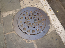 | どうも街に通りの案内がないと思ったら、案内は建物に直付けです。はめ込まれてます。マンホールも古いな。1934年製らしい。 |