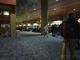 | LAS-SFOは余裕を持って朝一の便。空港に到着するとチェックインが異常に混んでいます。エコノミーの列は隣のUS Airまではみ出してます。かわいそうに。こちとら1Kなのでサクッと1Kレーンでチェックイン。 |