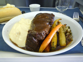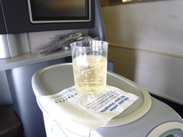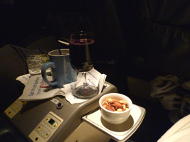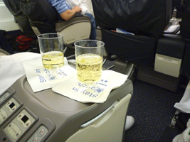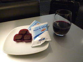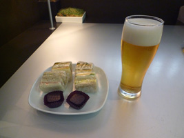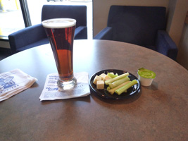 | 夕方に空港へ戻りレッドアイに乗り継ぎます。まずはRCCで搭乗前のビールを頂きましょう。ビールとワインは無料になったから良いね。メニューなんかあるんだね。 |