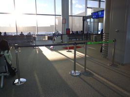 | ゲートもいつものごった返しがない。平和に搭乗します。最近は搭乗口カウンター横を「通せんぼ」してますね。ここからPAXが通路にはみ出さなくなっていいね。 |