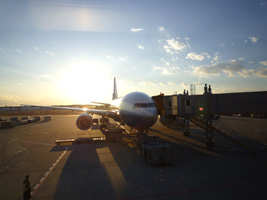 | 搭乗時間になりゲートに行くと若干ディレイ。暇なので「エイエヌエー7便の日本人様〜」のアナウンスがする。最後を看取ってみましょう。この職員が焦って連れてきた日本人様は大胆です。ゲート前でいきなり自分の荷物を広げ整理し出します。焦る職員。すげ〜ぞアジア人。 |