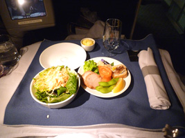 | フライトの半ばでのスナック ギャレー近くにサンドイッチをはじめ、各種スナックをご用意いたします。ご自由にお楽しみ下さい。 新鮮フルーツ、またはスイート&グルメスナック バナナ オールナチュラルpopchips Emeraldナチュラルウォールナッツ&アーモンド ミニ・トブラローネチョコレートバー 温かいカップ麺をご希望のお客様は乗務員にお申し出下さい ターキーとスイスチーズのサンドイッチ クリームチーズとフムスのサンドイッチ |