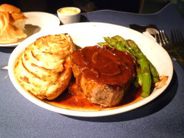 | はじめに スモークサーモン、 スイートセサミポーク 野菜の巻き寿司、 甘酢生姜 季節のグリーンサラダ ブルーチーズドレッシング、 またはセサミヴィネグレット メインコース 牛フィレ肉のステーキ、 バルサミコオニオンデミグラス ベークドスタッフポテトにチャイブ、 アスパラガス 最後に グルメチーズセレクション ぶどうとクラッカーを添えて コルビージャック、 カマンベール 特製デザート |