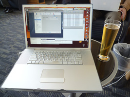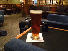 | 夕方に空港へ戻りレッドアイに乗り継ぎます。まずはRCCで搭乗前のビールを頂きましょう。ビールとワインは無料になったから良いね。メニューなんかあるんだね。 ここでちょいと時間があるので疲れを癒そうと思ったが4時間ディレイである。他の便を探すも軒並み満席。Yでリブックして貰えば他の客を降ろしてでもYに座れるのだが、この疲れているときにUAのYなんかいやじゃ〜。ということでだらだら待つこととなる。 |