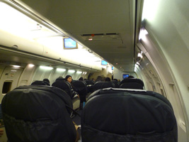 | 何時の間にか気絶していたら搭乗時間がやってきた。なるほど、LASからの到着便が遅れたんだな。こんな機材何とかしろよな。A320くらい腐るほど有るだろ。 |