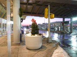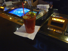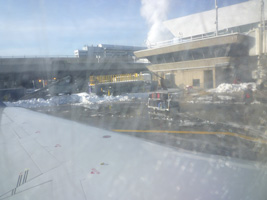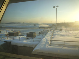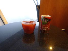 | そして朝のJFKに到着。荒れただけあって雪が積もっていますな。ラウンジで朝のブラッディメアリーミックスとトーストを頂きましょう。 |