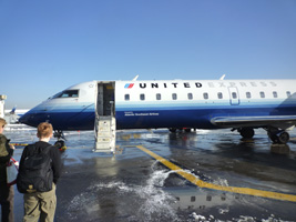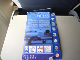 | その昔、31人乗りのJ31なんてプロペラ機で飛んだ覚えのあるJFK空のコミューター路線。今はCRJが飛んでます。もちろんモノクラス。しかし、汚いな、古いんじゃなくて汚い。窓も傷だらけだぞ。でもシートの幅はともかくピッチは狭くはない。 |