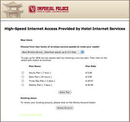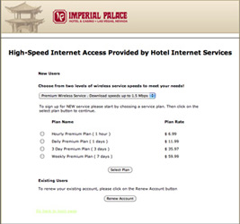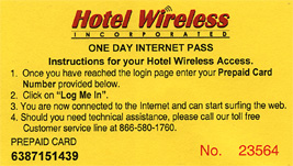 | さてインターネットであるがFastとSlowがある。画像は見にくいが、1.5Mbpsで$11.99、512Kbpsで$9.99である。もうチェックイン時に$9.99のを買っちまったよ。 |
