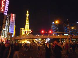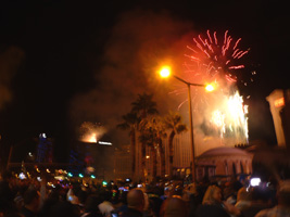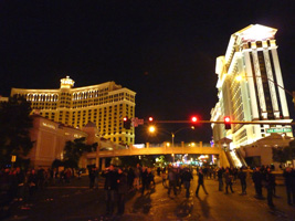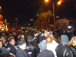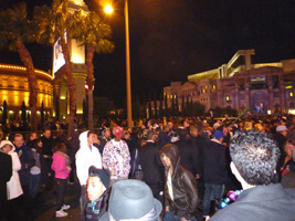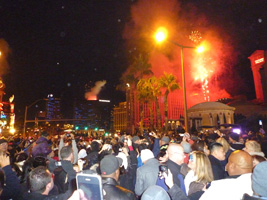 | と言うことで、11:40頃にストリップに行くとすっごい人....。どこから集まってきたんだ?民は既に雄叫びを上げまくっている。 本題のカウントダウンであるが、1分前くらいから各々が独自の時計でカウントダウンを始める。するといきなりシーザーズパレス上空に花火が上がる。民は狂喜乱舞。遅れてTI方面からも花火が上がる。まぁ、カウントダウンと言っても適当なんだな。そうい国だもんな。 大熊猫も適当にその辺の奴と盛り上がりカウントダウン終了。 |
