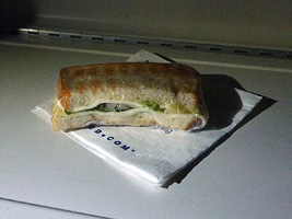 | なんのことはない。バナナとポテトチップと豆とチョコバーとうどんでスカイとサンドイッチだ。サンドイッチは不味い! |