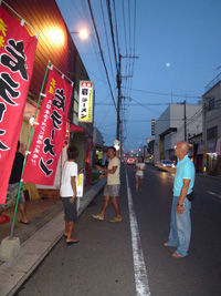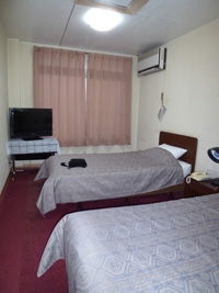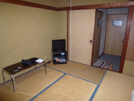 残り2泊。片っ端からホテル(でも5件しかない)に電話して何とか確保。今度は日向駅近くの「中央ビジネスホテル」である。(3500円/人)1Fが飲み屋、2Fがフロントと住居、3Fが客室。あの旅館から考えると天国である。リビングもある。でもネットは無い。 |