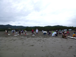 大会会場のお倉ヶ浜海岸で海に入りましょう。海に入った後は応援以外は暇なので飲むしかないのである。 |