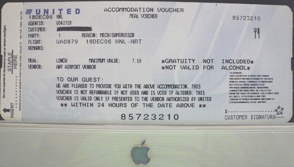キャンセルではなくオーバーナイトディレイして19 DEC UA879D HNL-NRTとなった18 DEC UA879 HNL-NRTであるが、飛ばなくなった時にホテル送迎までの時間つぶしの食事の代金として配られたミールクーポン($7.50)であるが、そんな物を使う時間は全く無いので当然のごとく余ったわけだ。